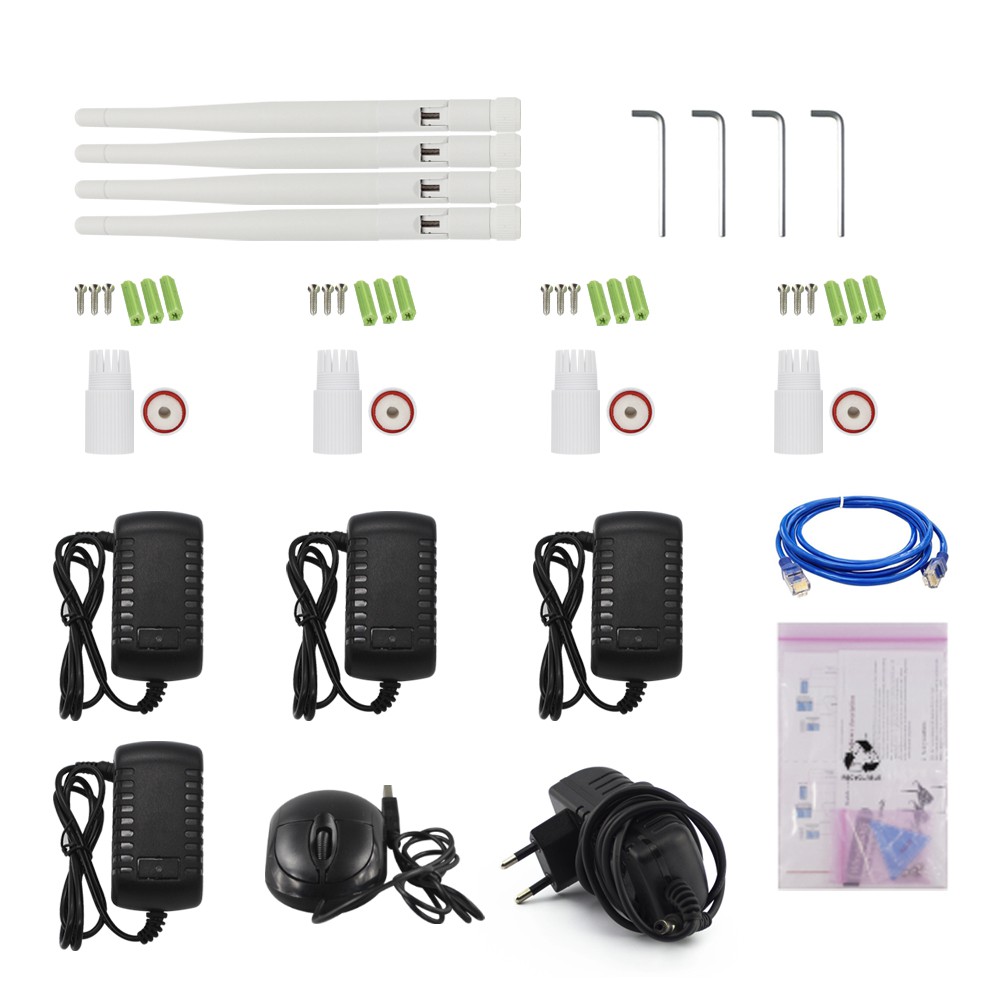 A: Kit with 4 DC12V 1A power adapter, respectively, for the four camera power supply. Sorry we did not provide