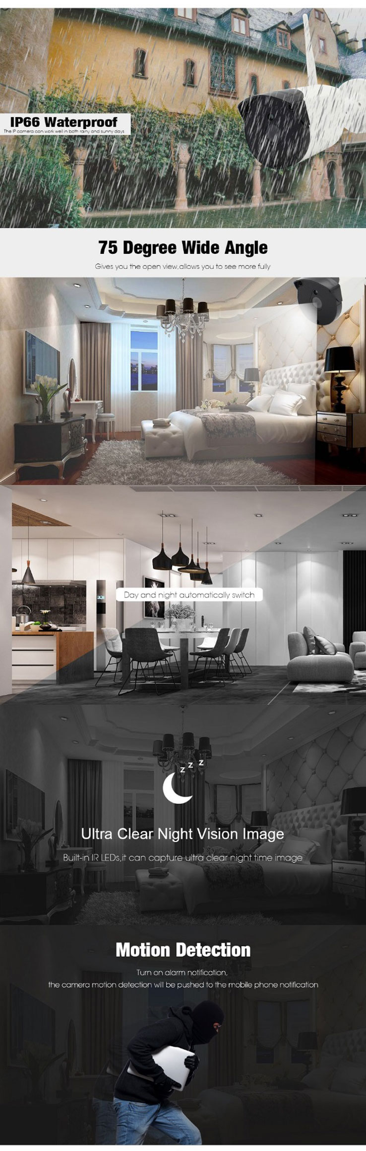 - Support night vision, IR distance is up to 15m