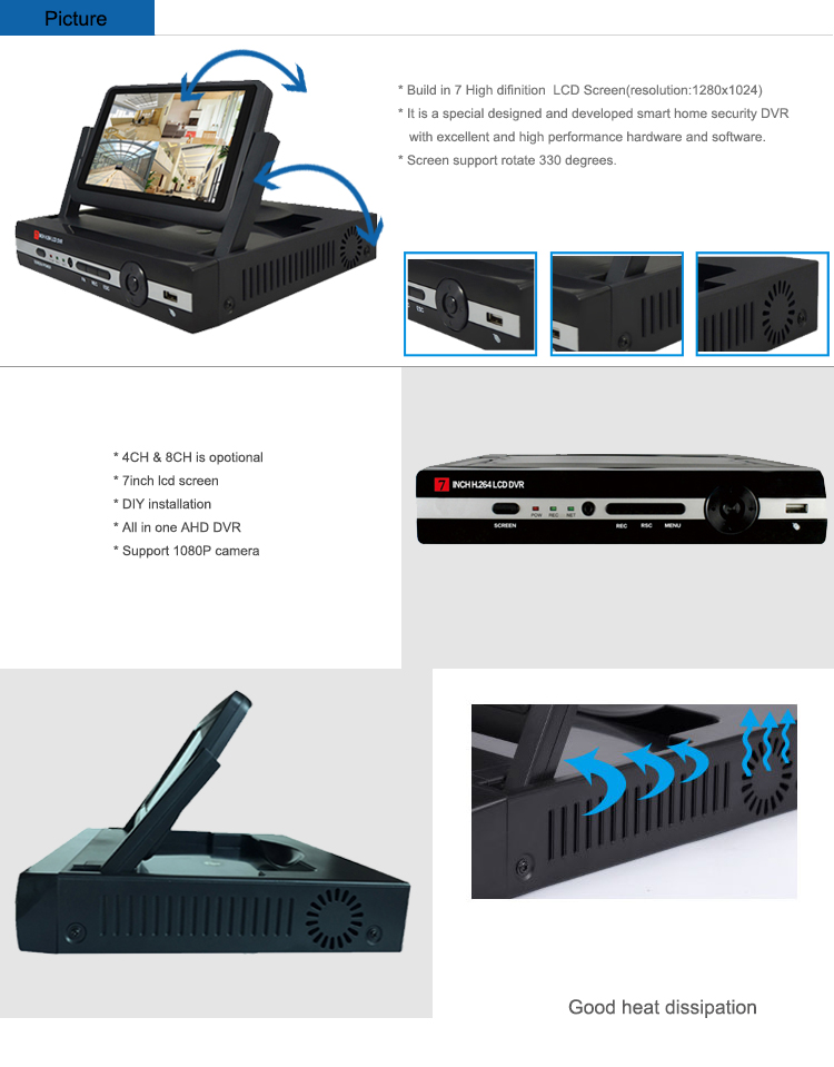 7 inch 4-ch HD video recorder dvr with AHD HD monitor with screen monitor