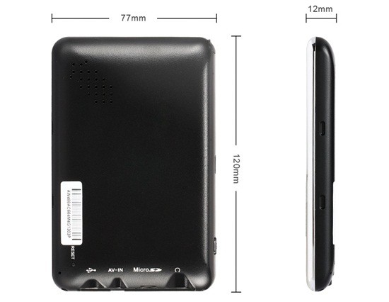 4.3" TFT resistive touch screen Equipped with MTK3351 CPU, Windows CE 6.0 OS Equipped with built-in 4 GB memory Support up to 32 GB TF card Equipped with MP3 player, MP4 player, digital photo frame, E-book, flash player, FM transmitter, game, calendar, calculator, unit conversion function