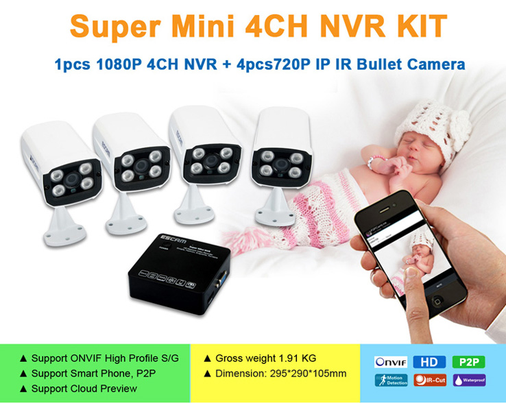 - H.264 Dual Stream 3.6MM Day/Night Waterproof IP Network Camera,Support Mobile Detection 4CH 1080P/720P Network Video Recorder (NVR)