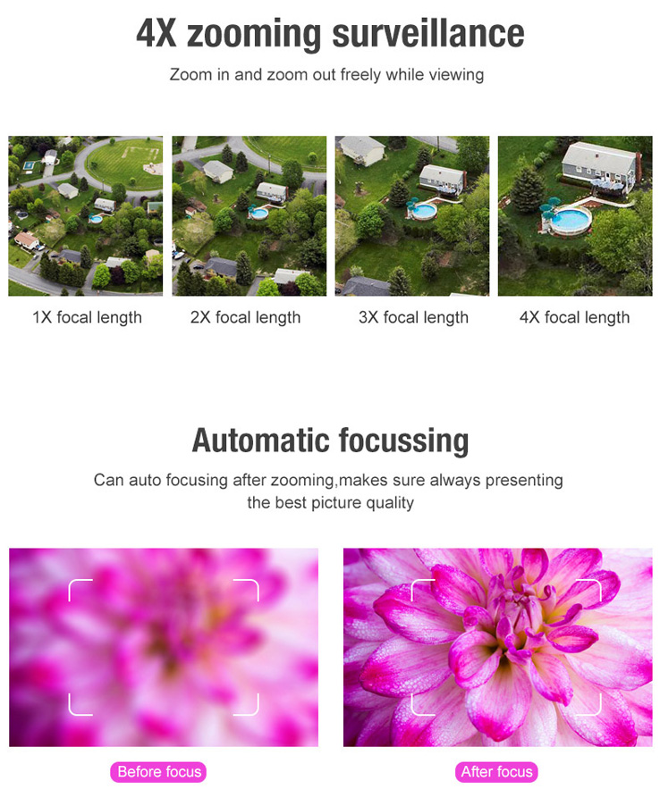 Automatic foccusing, can auto focussing after zooming. Automatic adjust videos and pictures quality.