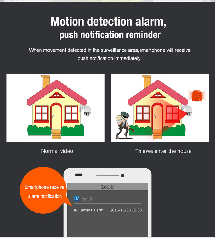Motion detection alarm, record and push the alarm notification to your mobile phone.