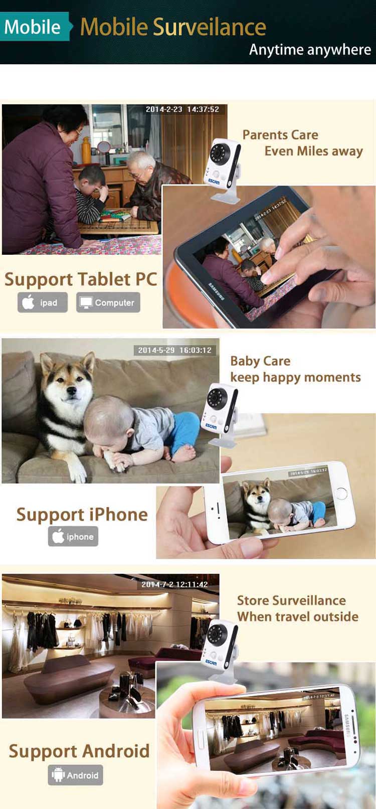 ● No need to preset camera, offer free plug and play, support QR code scanning to view, easy setup