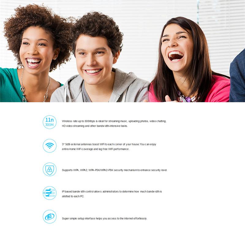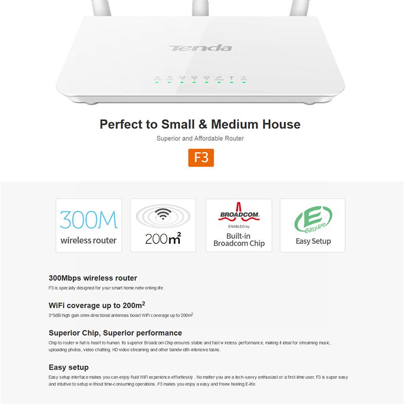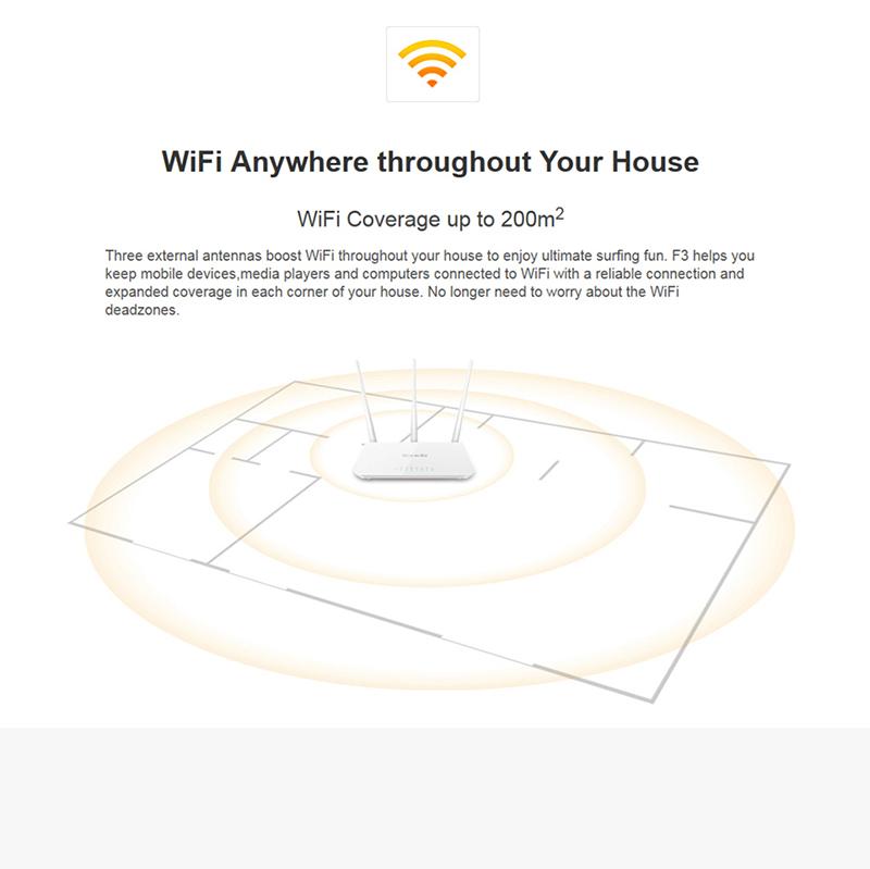 F3 is designed for your smart home networking. 3*5dBi high gain omni-directional antennas boost WiFi coverage up to 2000 sq. ft. Its superior Broadcom Chip ensures stable and fast wireless performance which is ideal for streaming music, uploading photos, video chatting, HD video streaming and other bandwidth-intensive tasks. Wireless transmission rate up to 300Mbps, 3* 5dBi external antennas, Supports WPA/WPA2/WPA-PSK/WPA2-PSK security encryption, IP based bandwidth control allows administrators to determine how much bandwidth is allotted to each PC, Super simple setup interface helps you access to the Internet easily。